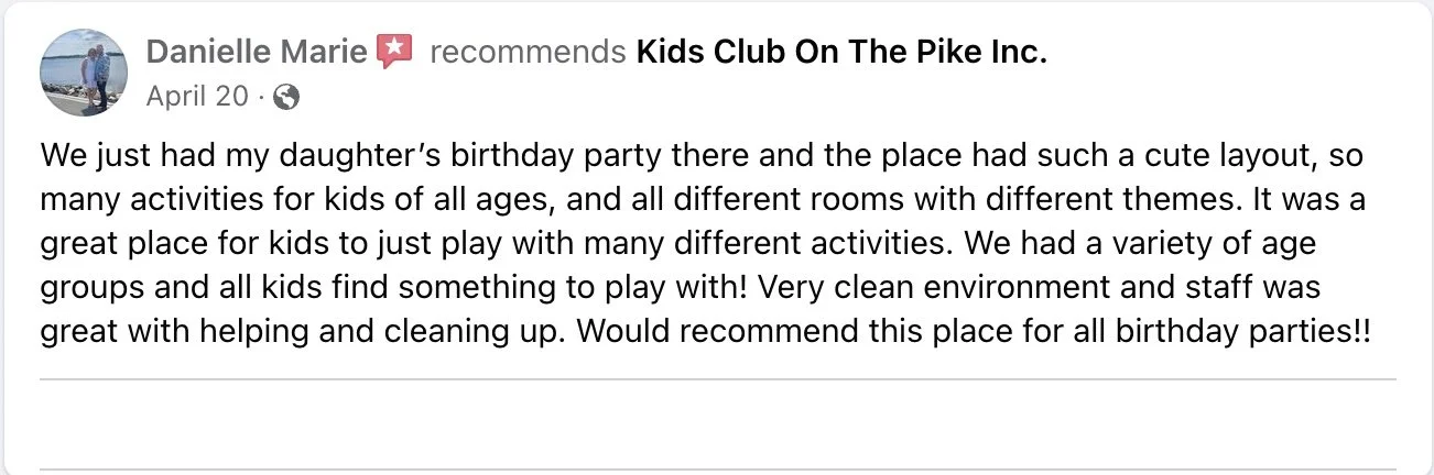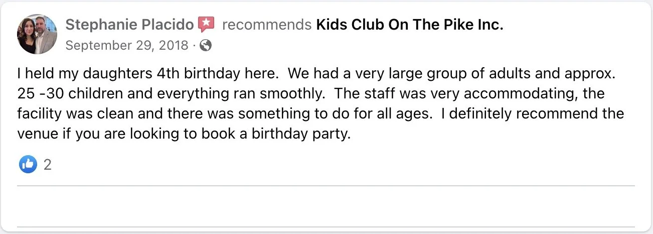 “We just had our daughters 1st birthday party here on Sunday and we had a BLAST. The place was a huge hit with both kids & adults. The lady that was there to help us was absolutely amazing, sweet & helpful. I would definitely recommend this place and would do another party here. Thank you Kids Club!!!!! Xoxoxoxo - Happy Mom”